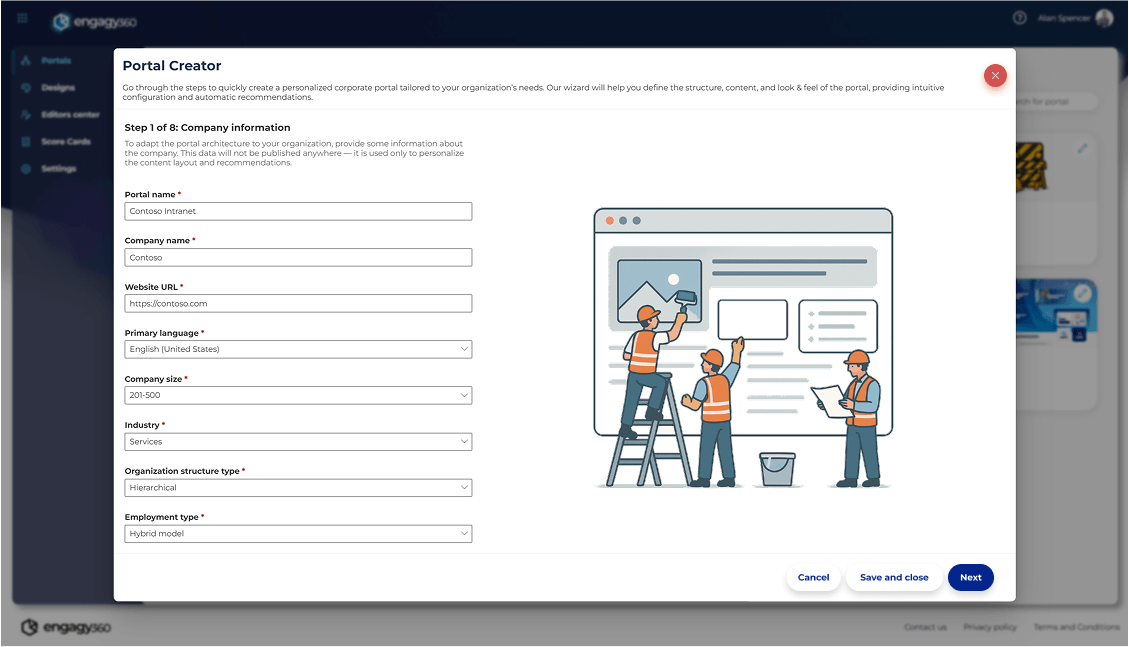 With Engagy360, you gain a guided creation flow that makes SharePoint intranet development simple and effective. Self-service tools help you shape the right structure, design an engaging look and feel, and launch without needing costly specialists. AI-powered guidance gives you a strong foundation from the very start, so your intranet goes live ready to connect people, content, and communication.