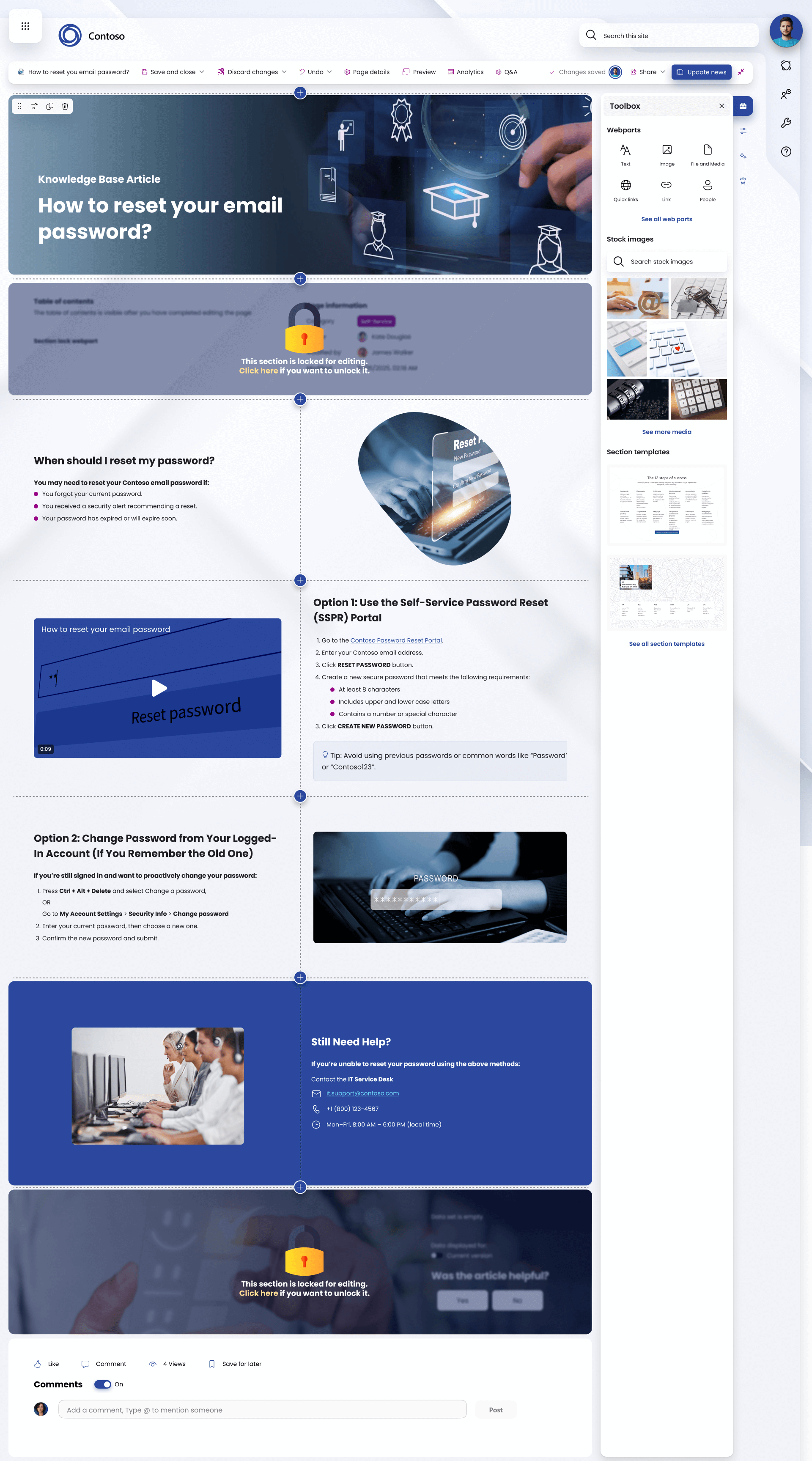 Turn default SharePoint pages into dynamic wikis that encourage collaboration and structured editing. Engagy360 Wiki Extensions overlay modern SharePoint pages with in-line section locking, enabling subject-matter experts to update specific content blocks without affecting the rest of the article. A built-in table of contents auto-generates based on headings, while real-time feedback widgets let readers rate usefulness or submit comments directly on the page.