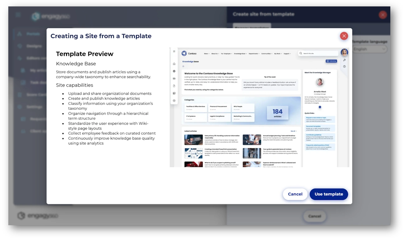 Engagy360 provides a complete Knowledge Base site template designed for rapid deployment. The template features a modern landing page with category browser and intuitive web parts that showcase popular, recent, and recommended articles. Each knowledge article follows a consistent layout, complete with metadata tagging, author attribution, and visually engaging headers.