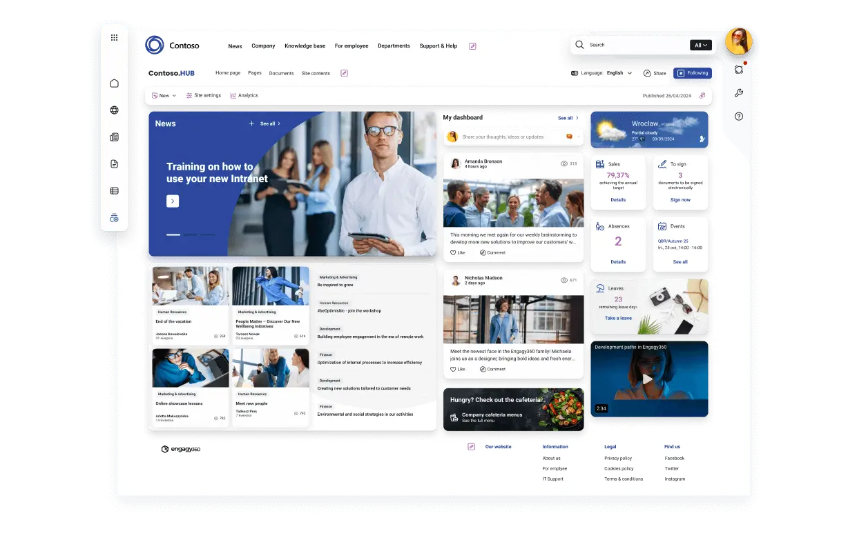 Ensure employees stay informed with a centralized News Hub that delivers updates tailored to them. Categorized news and personalized content make it easy to see what matters. No need to browse multiple portals. With quick access to the latest publications, everyone stays up to date without extra effort.