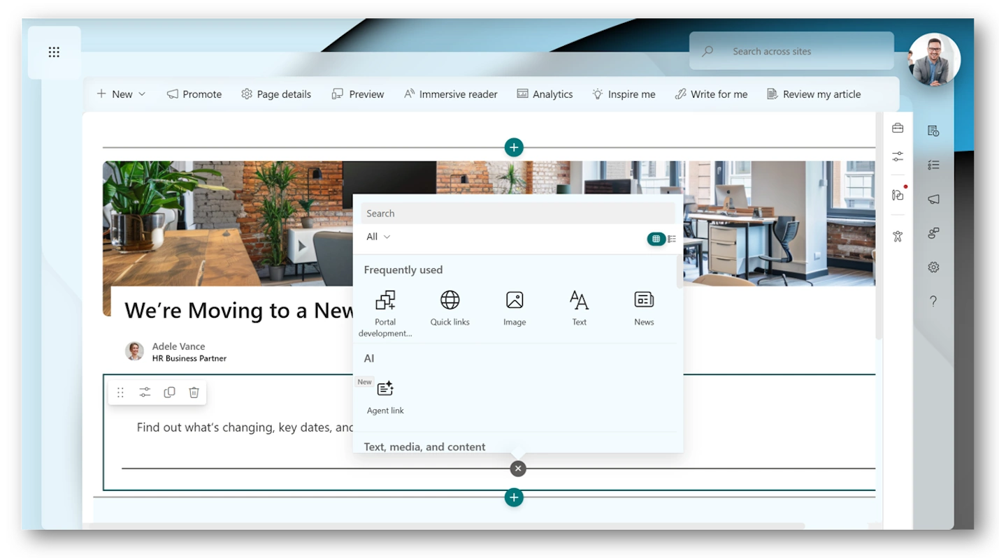 Deliver relevant updates, from crucial company news to wellbeing advice, with media-rich News Articles built on SharePoint’s Modern CMS. The intuitive WYSIWYG editor lets you drag, drop, and see results instantly, making content creation simple and efficient.