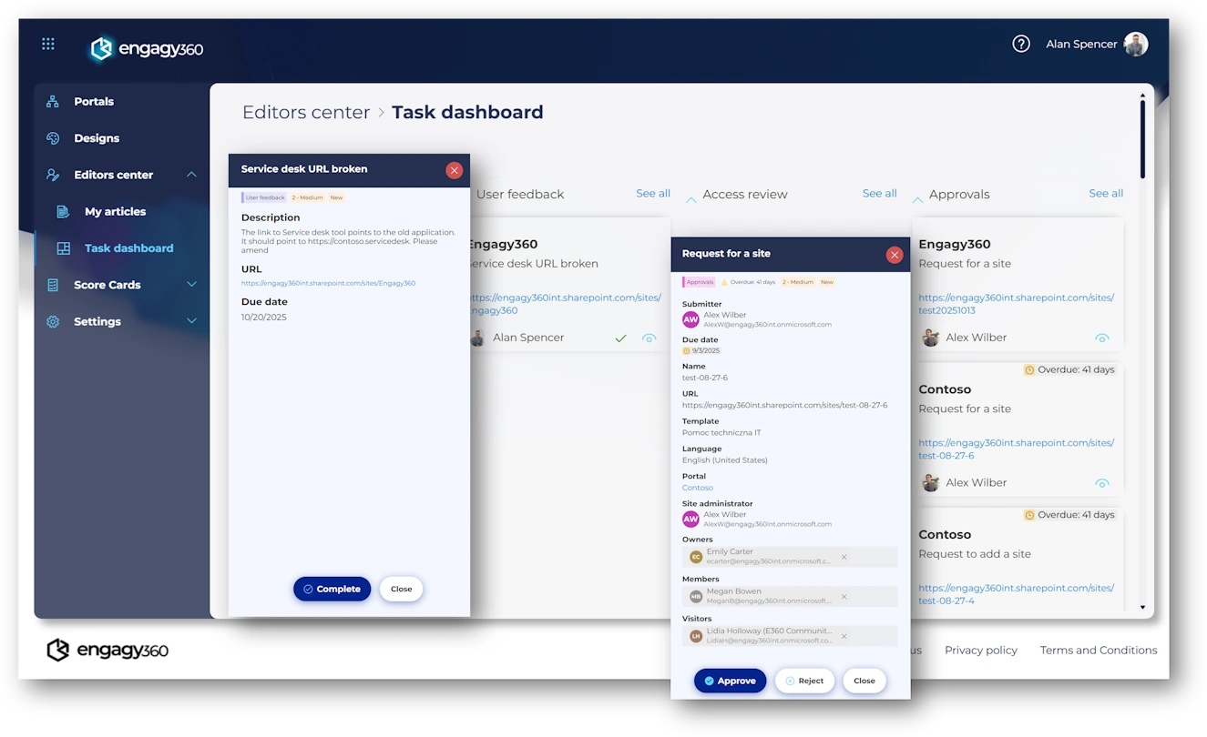 Managing an intranet involves handling publications, content updates, user requests, and monitoring multiple areas, which can easily lead to overlooked tasks. Engagy’s Editor’s Tasks Board provides a clear and standardized view of responsibilities, allowing editors to browse tasks efficiently. This keeps deadlines on track and ensures content stays consistently fresh.