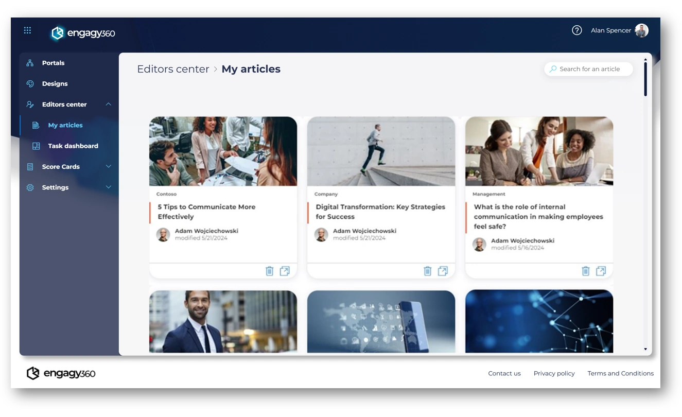 SharePoint supports multi-site publishing, but keeping track of everything can be overwhelming. Engagy’s Article Board centralizes content management in a single intuitive dashboard, making it easy to browse, navigate, and monitor articles. Editors can quickly check usage statistics, remove outdated content, and maintain an organized and efficient workflow.